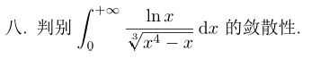 由于\[\ln x\le x,\]而\[\frac{\ln x}{\sqrt[3]{x^4-x}}\backsim \frac{x}{x^{\frac{4}{3}}}=x^{-\frac{1}{3}},\]