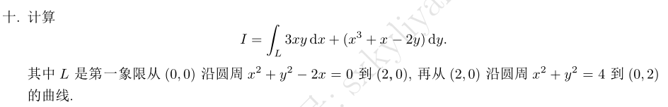 根据积分曲线,为方便计算,可将积分区域分为两部分,分别添加辅助曲线使之得两个闭合区域。再用格林公式分别求解之,并注意到曲线积分的方向。令\[P=3xy,Q=x^3+x-2y.\]\[\frac{\partial P}{\partial y}=3x,\frac{\partial Q}{\partial x}=3x^2+1.\]\[I=\iint\limits_{D}(\frac{\partial P}{\partial y}-\frac{\partial Q}{\partial x})dxdy=\iint\limits_{D}(3x-3x^2-1)dxdy.\]          $$D_1:\{L_1:(x-1)^2+y^2=1,y=0\}$$\[x=\rho \cos \theta ,y=\rho \sin \theta,0\le \rho\le 2,0\le \theta \le \frac{\pi}{2}.\]\[I_1=-\iint\limits_{D_1}(3x-3x^2-1)dxdy=-\int_{0}^{2}\rho d\rho\int_{0}^{\frac{\pi}{2}}(3\rho \cos \theta-3(\rho \cos \theta)^2-1)d\theta =-8+\frac{5}{2}\pi.\]           $$D_2:\{L_2:x^2+y^2=4.x=0,\}$$\[x=r\cos \theta,y=r\sin \theta,0\le r\le 2,0\le \theta \le \frac{\pi}{2}.\]\[I_2=\iint\limits_{D_2}(3x-3x^2-1)dxdy=\int_{0}^{\frac{\pi}{2}}d\theta \int_{0}^{2}(3r \cos \theta-3(r \cos \theta)^2-1)rdr=8-4\pi.\]