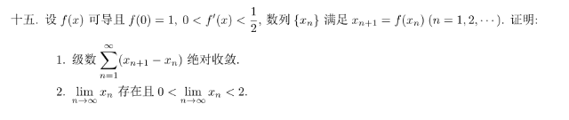 (2)、由已知条件及上面的结论,知级数部分和的极限存在\[S_N=\displaystyle\sum_{n=1}^{N}(x_{n+1}-x_n)=x_{N+1}-x_1=x_{N+1}-f(0)=x_{N+1}-1.\]\[\lim_{N\to\infty}x_{N+1}-1= \lim_{N\to\infty}S_N\le1.\]\[\therefore 0\le\lim_{n\to\infty}x_{n}\le 2.\]