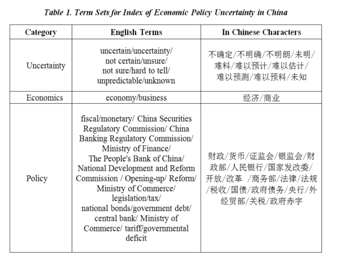 2.为了构建中国的经济政策不确定性指数,他们首先获得在三个术语集中至少包含一个术语的文章的月度计数:经济、政策和不确定性。表1报告了每组使用汉字的术语和相应的英文翻译。在第二步中,他们将原始的每月 EPU 计数按同一报纸和同一月的总文章数进行缩放。