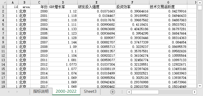 全国30个省份创新发展2000-2022GDP增长率研发投人强度投资效率技术交易活跃度