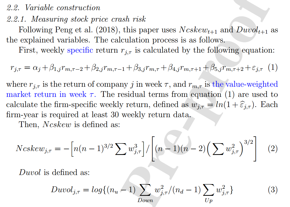包含NCSKEW和DUVOL的数据结果,可以省下计算的流程,数据真实可靠,已用在Cen, T. (2023). Green finance reform and stock price crash risk: Evidence from Chinese heavily polluting companies. Finance Research Letters, 104133.等文章中
