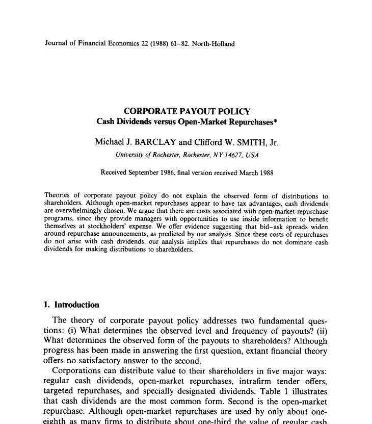 【文题(必填)】Corporate payout policy:Cash dividends versus open-market repurchases