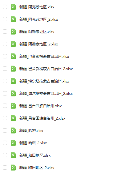 新疆自治区:伊犁哈萨克自治州、乌鲁木齐、吐鲁番、塔城地区、克孜勒苏柯尔克孜自治州、克拉玛依、喀什地区、和田地区、哈密、昌吉回族自治州、博尔塔拉蒙古自治州、巴音郭楞蒙古自治州、阿勒泰地区、阿克苏地区