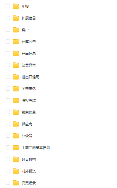 工商注册、专利信息、邮箱、手机号、年报、客户、商标信息、融资历程、资质证书、股权冻结、网站备案、软件著作权、竞品信息、税务评级、扩展信息、微博、行政处罚、经营异常、行政许可、开庭公告、对外投资、固定电话、失信被执行人、股东信息、分支机构、公众号、供应商、作品著作权、企业业务、主要人员、变更记录、一般纳税人、进出口信用