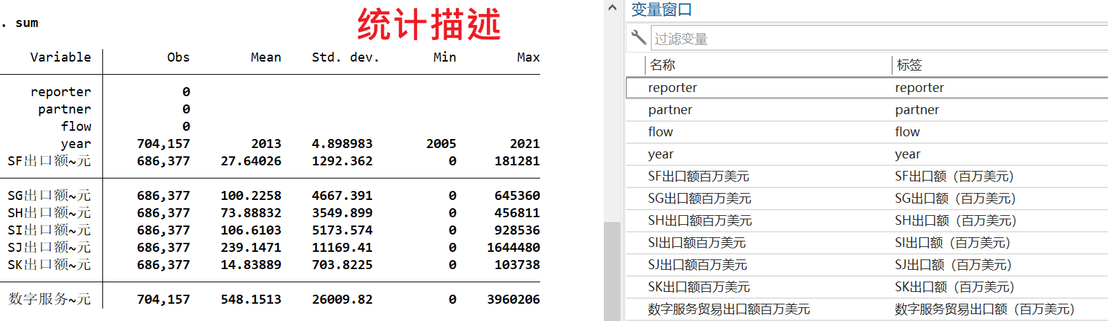 1.参照周念利等(2022)及陈松(2022)的方法,采用世界贸易组织(WTO)、世界货币基金组织(IMF)及经合组织(OECD)关于数字服务贸易的统计口径,依照 EBOP的分类方式,将涉及数字服务贸易的六个部门的服务出口额进行加总得到数字服务进出口总数据。
