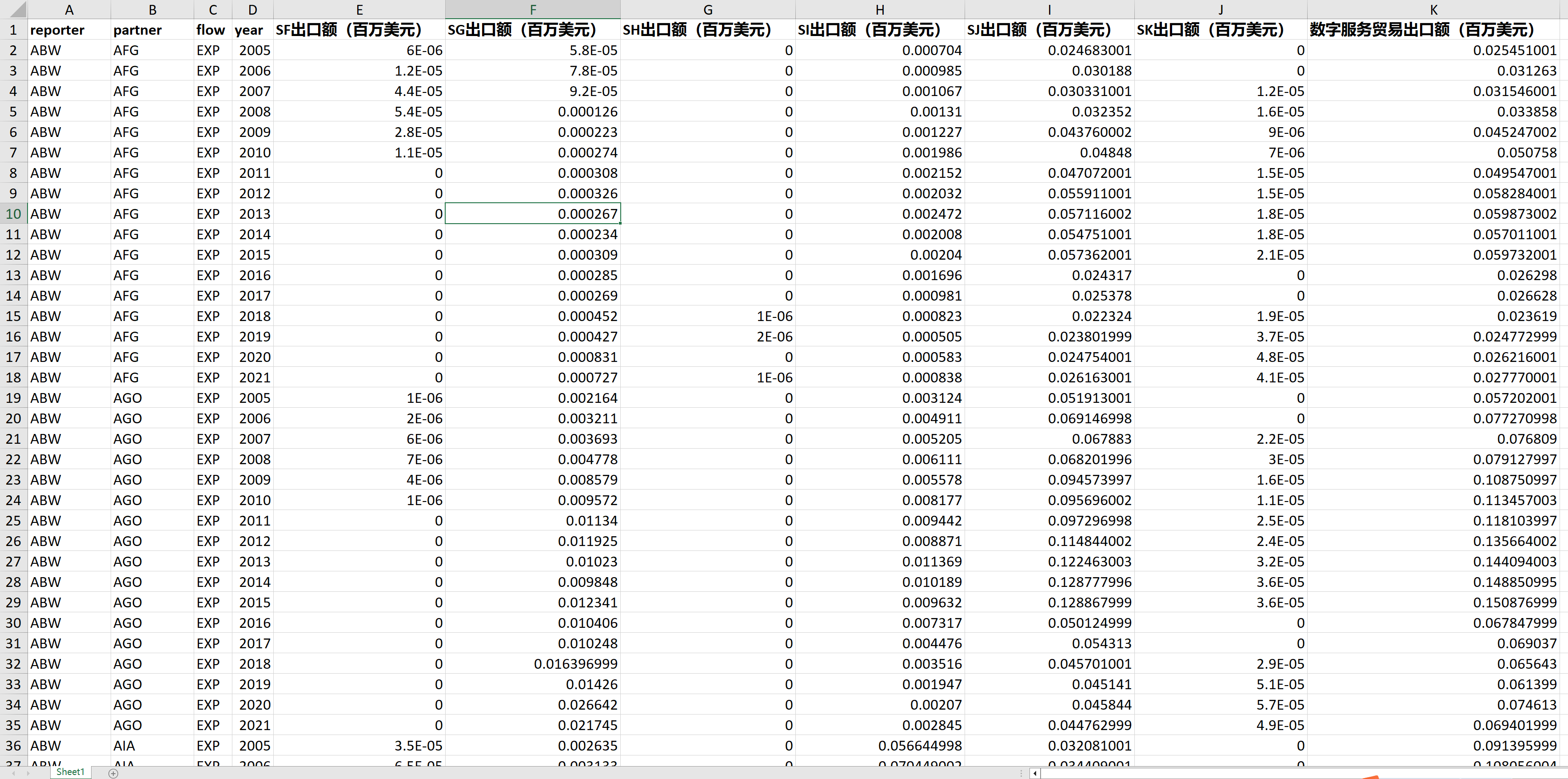 各国双边数字服务贸易进出口额2005-2021年,根据以下说明测算的数字服务贸易数据,整理好的面板数据!