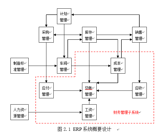 本ERP系统计划包括:销售管理,库存管理,采购管理,制造标准管理,计划管理,车间管理(生产管理),人力资源管理,财务管理共8个子系统,各子系统的数据流关系如图2.1所示。其中总帐管理,应收管理,应付管理,成本管理,工资管理五个模块均属于财务管理子系统。