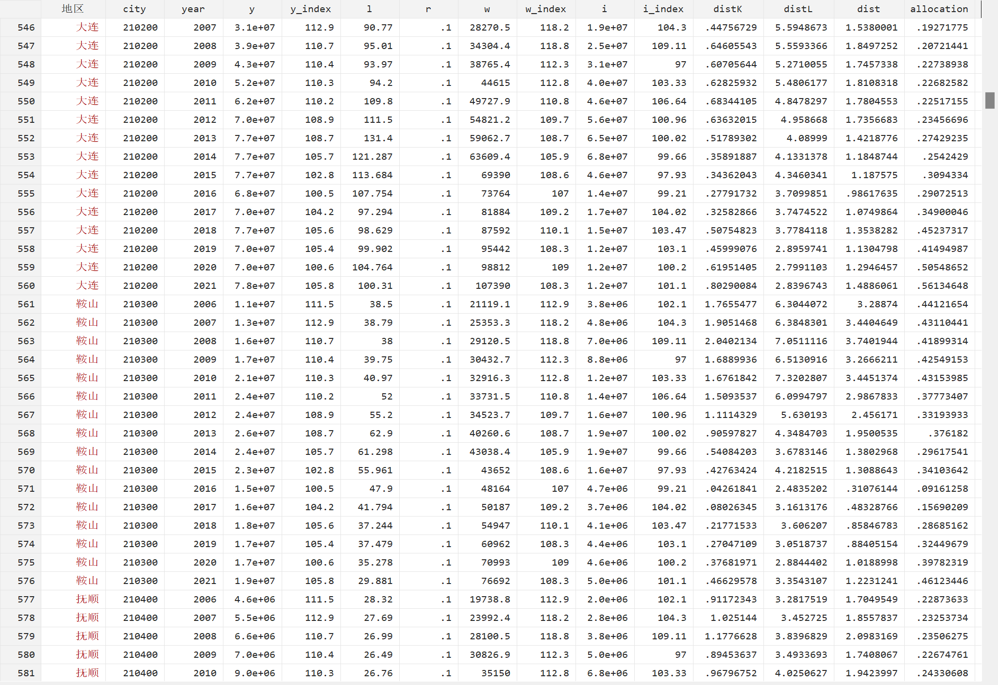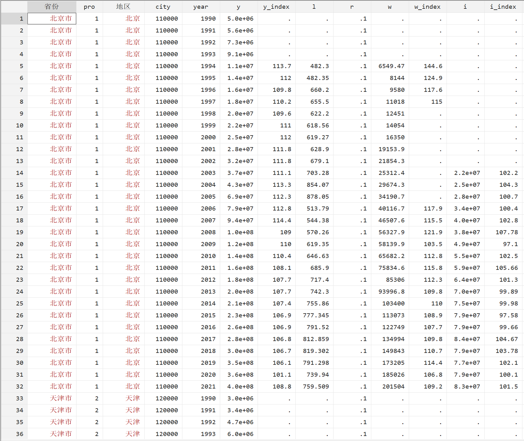 指标包括:省份、省份编码、城市名称、城市行政区码、年份、地区生产总值(万元)、地区生产总值指数(由于城市层面生产总值指数缺失严重,处理时选用省级生产总值指数代替,后面工资指数和固定资产投资价格指数同理)、年末单位从业人员数、劳动价格、固定资产投资等