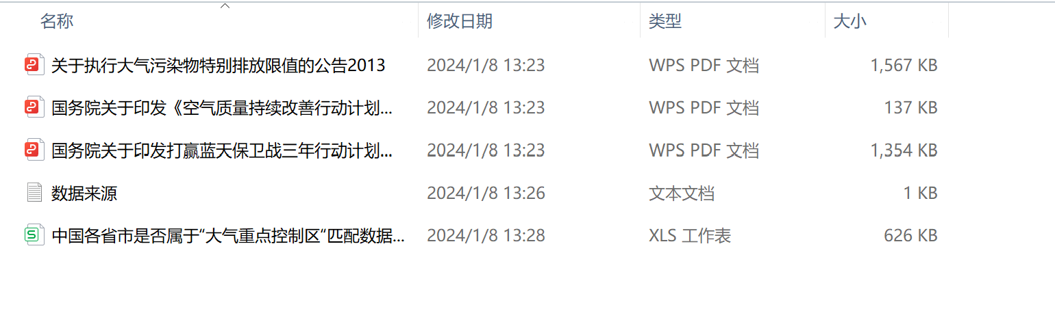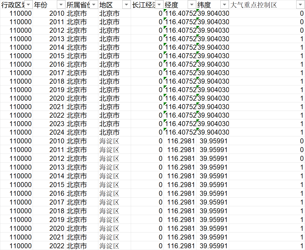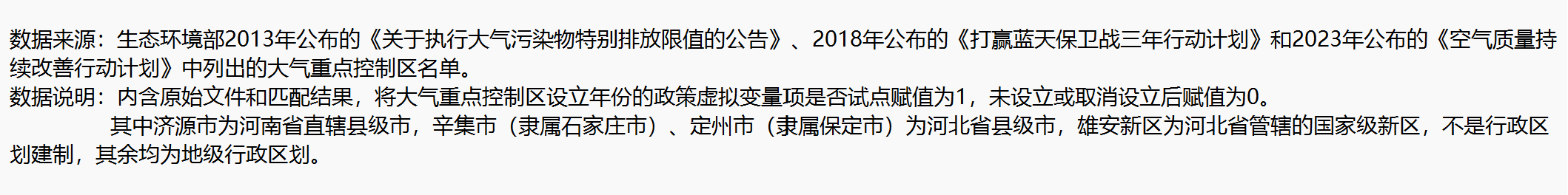 数据说明:内含原始文件和匹配结果,将大气重点控制区设立年份的政策虚拟变量项是否试点赋值为1,未设立或取消设立后赋值为0。其中济源市为河南省直辖县级市,辛集市(隶属石家庄市)、定州市(隶属保定市)为河北省县级市,雄安新区为河北省管辖的国家级新区,不是行政区划建制,其余均为地级行政区划。