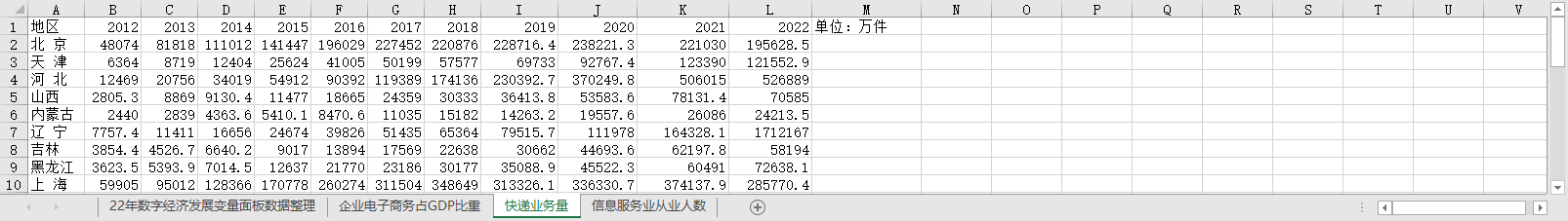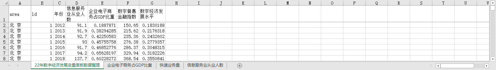 area id 年份 信息服务业从业人数 企业电子商务占GDP比重 数字普惠金融指数 数字经济发展水平 快递业务量
