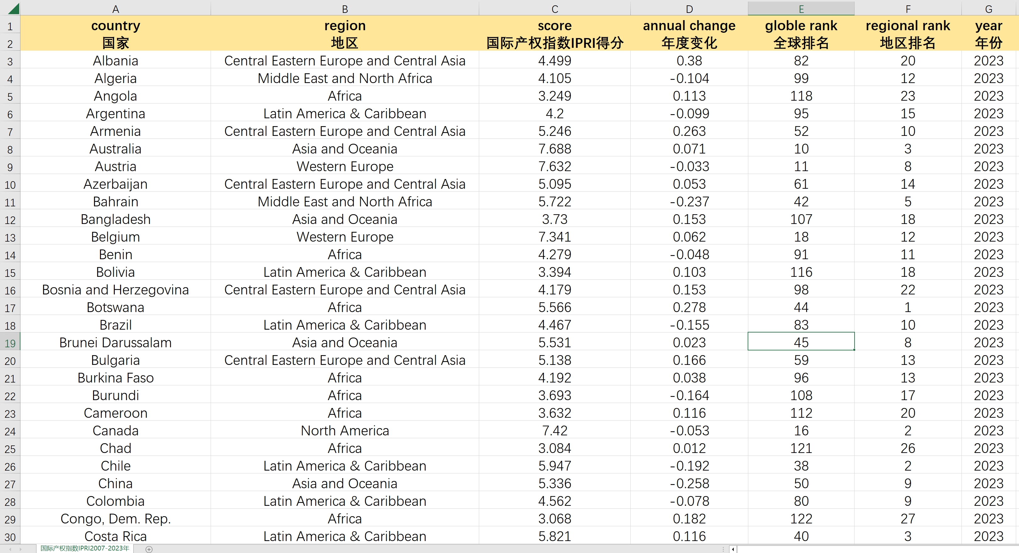 国际产权指数IPRI !!2007-2023年!IPRI 是政策制定者、商界和公民活动家的工具,强调产权在创造繁荣经济和公正社会方面的重要作用。 此外,2023 年指数还考察了产权与其他经济和社会福祉指标之间的牢固关系,包括性别平等、能源、创新、竞争、社会流动性、研发、人类发展、风险投资以及衡量互联网连接性。