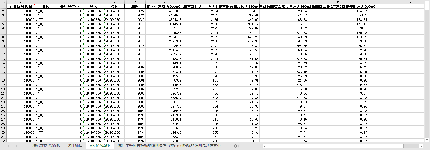 excel数据文件包原始数据-宽面板(由于多年度指标不同存在缺失值)、线性插值、ARIMA填补三个版本,提供您参考使用。