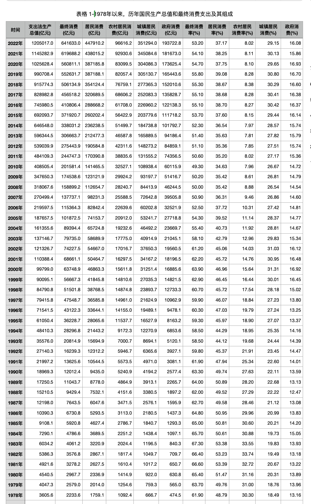 综上,1978年改革以来,最终消费占国内生产总值总体下降,其中政府消费占国内生产总值小幅增长,下降主要是由于居民消费占国内生产总值下降所引起。