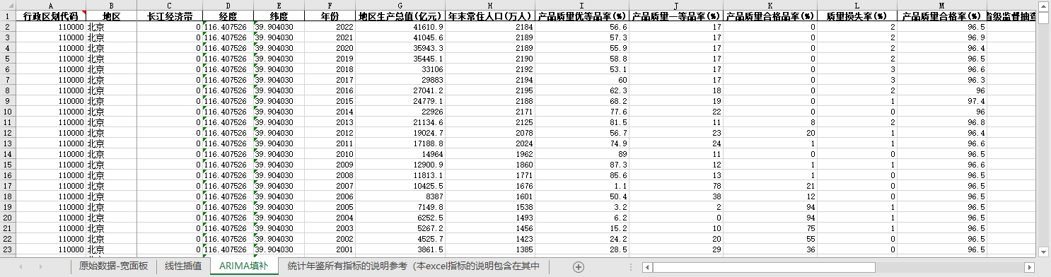 excel数据文件包原始数据-宽面板(由于多年度指标不同存在缺失值)、线性插值、ARIMA填补三个版本,提供您参考使用。