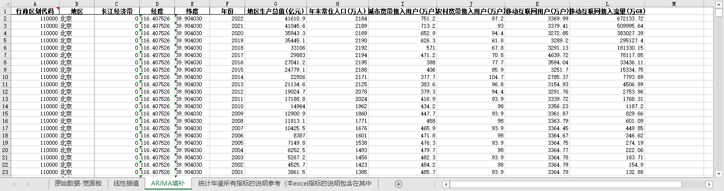 excel数据文件包原始数据-宽面板(由于多年度指标不同存在缺失值)、线性插值、ARIMA填补三个版本,提供您参考使用。