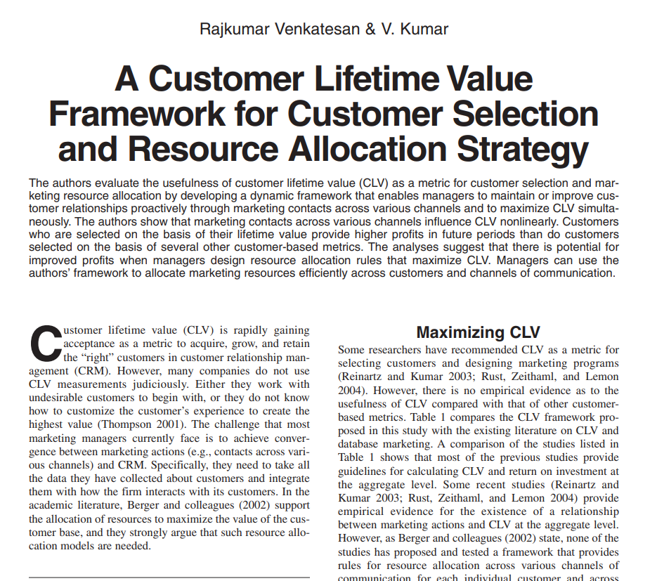 求A Customer Lifetime Value Framework for Customer Selection and Resource Alloca