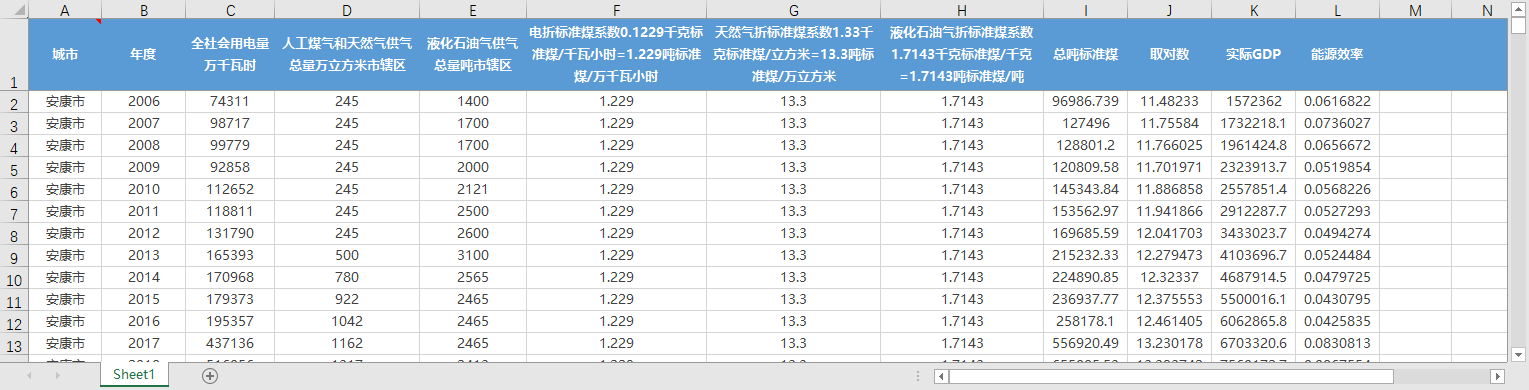 城市、年度、全社会用电量万千瓦时、人工煤气和天然气供气总量万立方米市辖区、液化石油气供气总量吨市辖区、电折标准煤系数1.229吨标准煤/万千瓦小时、天然气折标准煤系数13.3吨标准煤/万立方米、液化石油气折标准煤系数1.7143吨标准煤/吨、总吨标准煤、取对数、实际GDP、能源效率