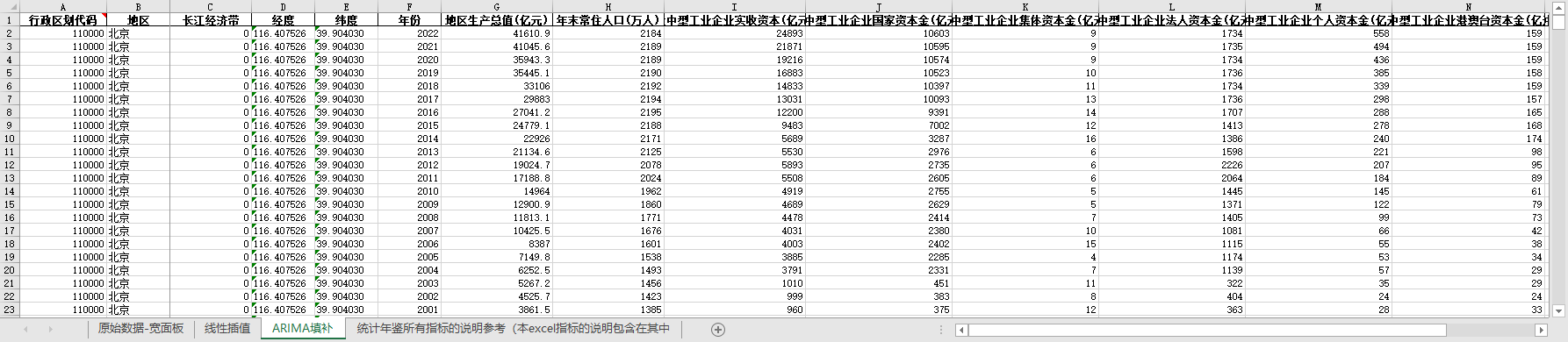 excel数据文件包原始数据-宽面板(由于多年度指标不同存在缺失值)、线性插值、ARIMA填补三个版本,提供您参考使用。
