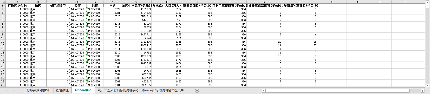 excel数据文件包原始数据-宽面板(由于多年度指标不同存在缺失值)、线性插值、ARIMA填补三个版本,提供您参考使用。