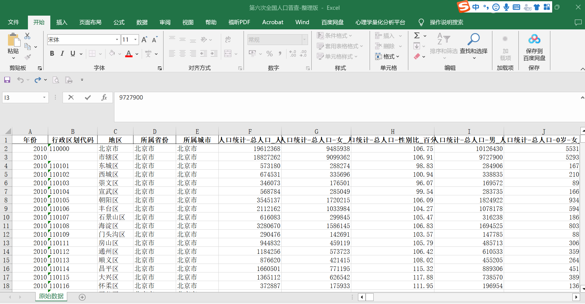一、数据介绍数据名称:第六次全国人口普查-整理版