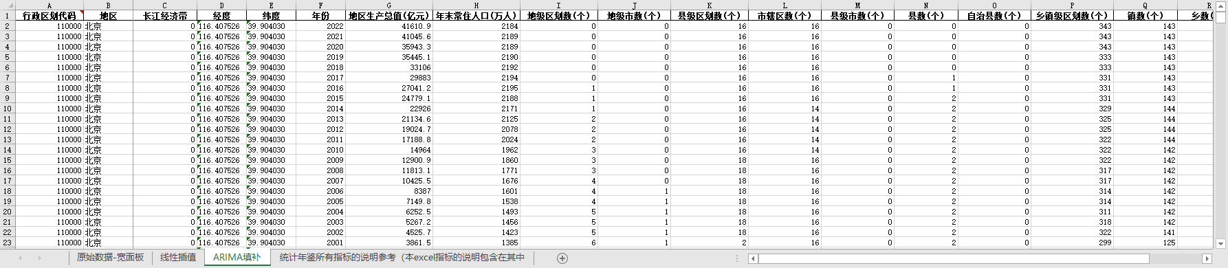 excel数据文件包原始数据-宽面板(由于多年度指标不同存在缺失值)、线性插值、ARIMA填补三个版本,提供您参考使用。