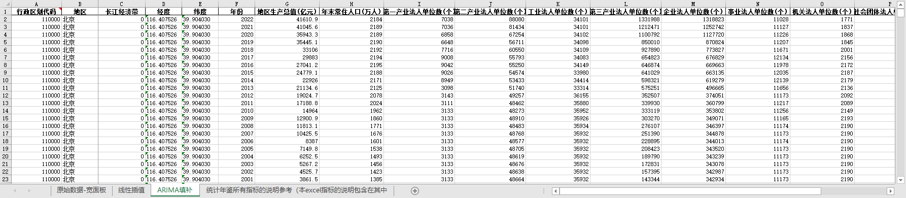 excel数据文件包原始数据-宽面板(由于多年度指标不同存在缺失值)、线性插值、ARIMA填补三个版本,提供您参考使用。
