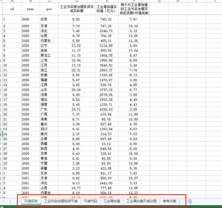 工业污染源治理投资完成实际额、工业增加值实际值、环境规制强度、工业污染源治理投资完成实际额、工业出产品价格指数、工业增加值实际值等指标