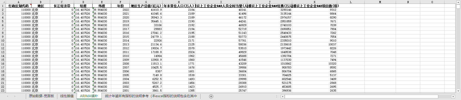 excel数据文件包原始数据-宽面板(由于多年度指标不同存在缺失值)、线性插值、ARIMA填补三个版本,提供您参考使用。