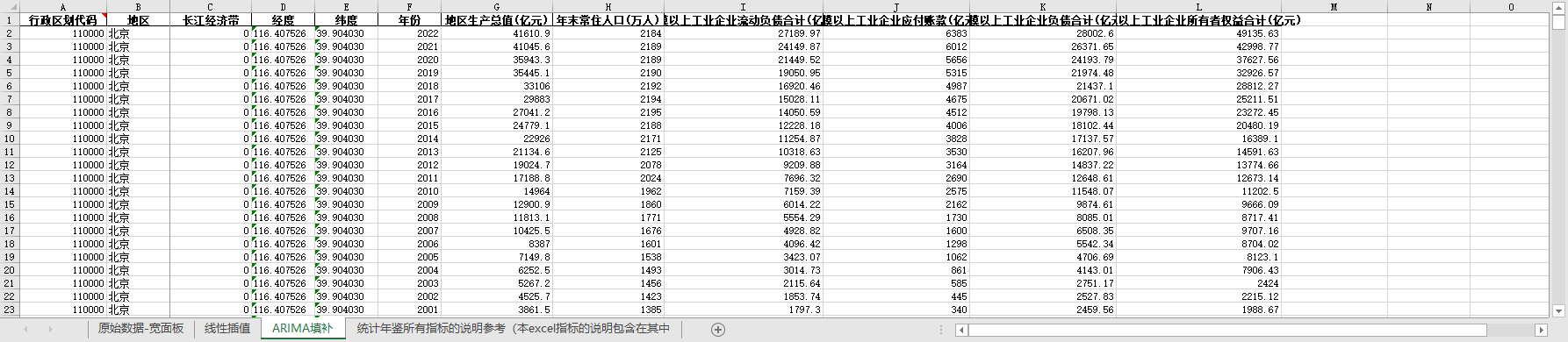 excel数据文件包原始数据-宽面板(由于多年度指标不同存在缺失值)、线性插值、ARIMA填补三个版本,提供您参考使用。