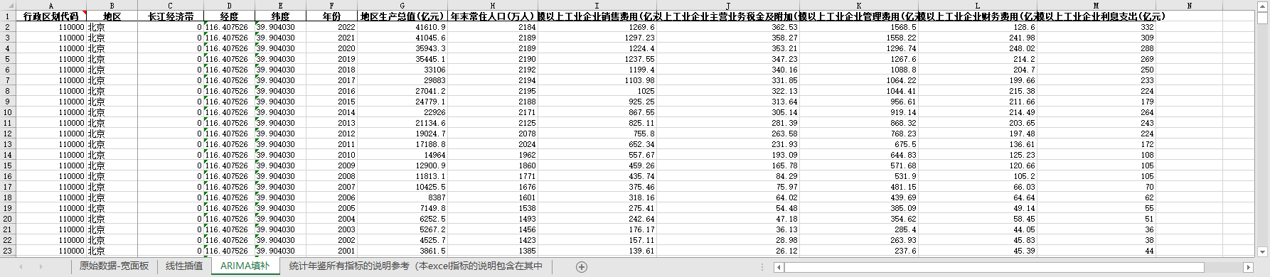 excel数据文件包原始数据-宽面板(由于多年度指标不同存在缺失值)、线性插值、ARIMA填补三个版本,提供您参考使用。