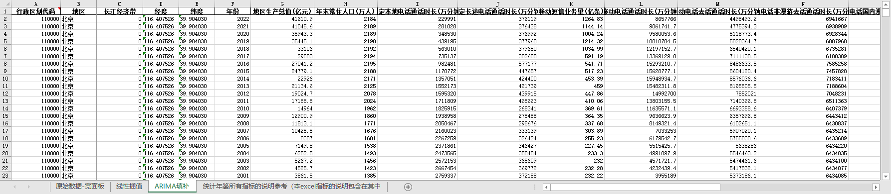 excel数据文件包原始数据-宽面板(由于多年度指标不同存在缺失值)、线性插值、ARIMA填补三个版本,提供您参考使用。