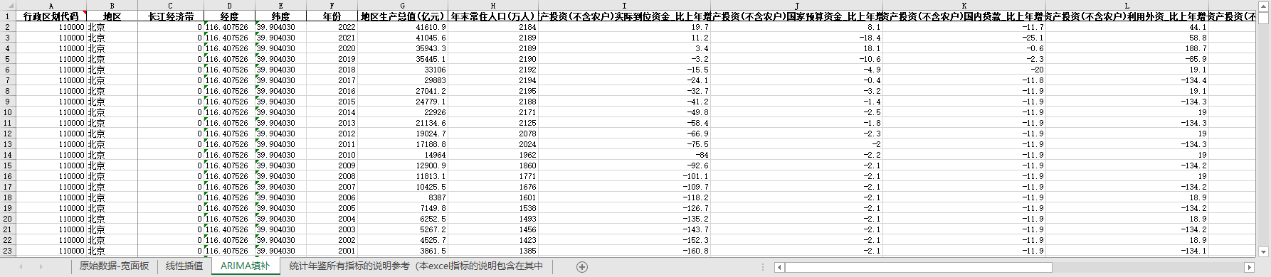 excel数据文件包原始数据-宽面板(由于多年度指标不同存在缺失值)、线性插值、ARIMA填补三个版本,提供您参考使用。