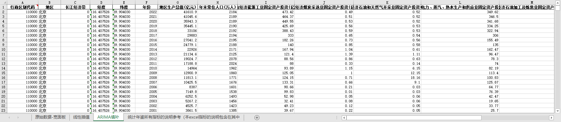 excel数据文件包原始数据-宽面板(由于多年度指标不同存在缺失值)、线性插值、ARIMA填补三个版本,提供您参考使用。