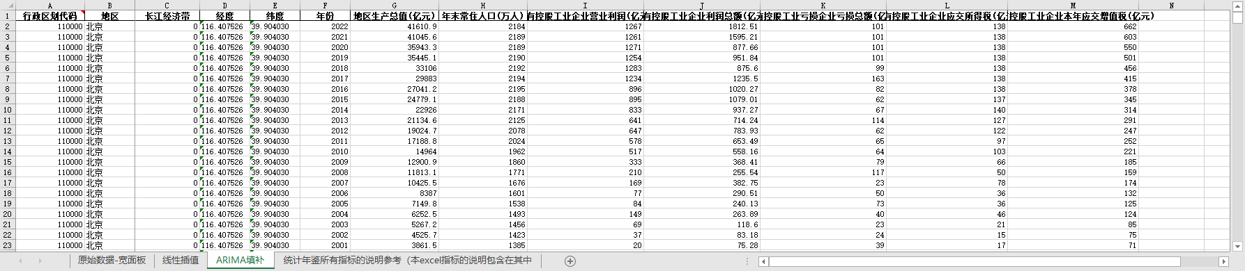 excel数据文件包原始数据-宽面板(由于多年度指标不同存在缺失值)、线性插值、ARIMA填补三个版本,提供您参考使用。