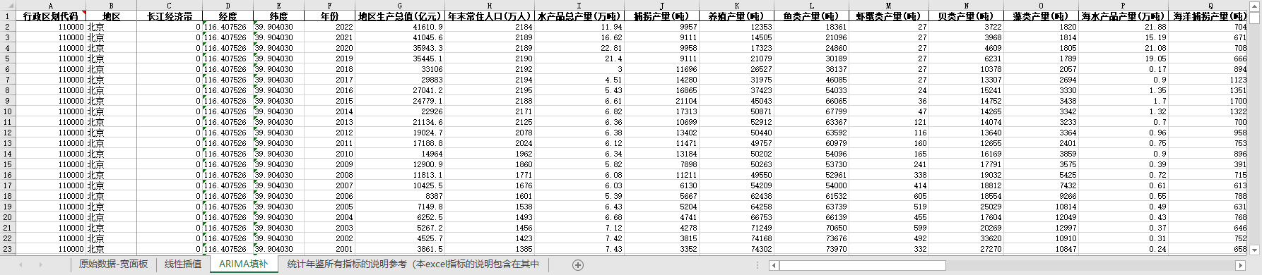 excel数据文件包原始数据-宽面板(由于多年度指标不同存在缺失值)、线性插值、ARIMA填补三个版本,提供您参考使用。