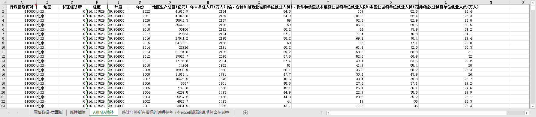 excel数据文件包原始数据-宽面板(由于多年度指标不同存在缺失值)、线性插值、ARIMA填补三个版本,提供您参考使用。