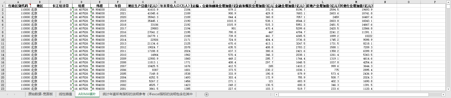 excel数据文件包原始数据-宽面板(由于多年度指标不同存在缺失值)、线性插值、ARIMA填补三个版本,提供您参考使用。
