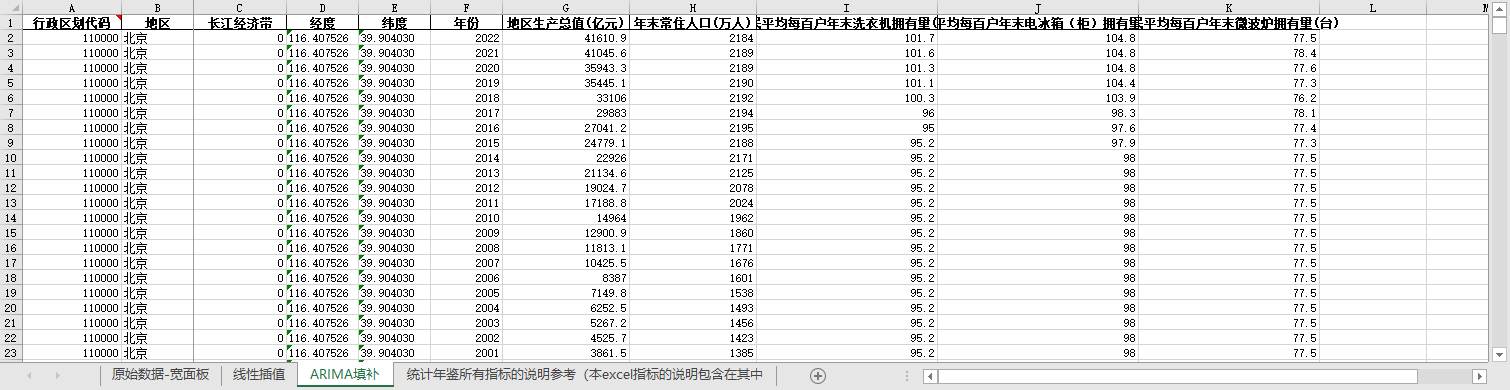 excel数据文件包原始数据-宽面板(由于多年度指标不同存在缺失值)、线性插值、ARIMA填补三个版本,提供您参考使用。