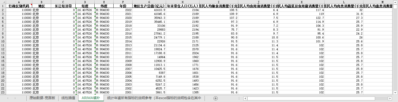 excel数据文件包原始数据-宽面板(由于多年度指标不同存在缺失值)、线性插值、ARIMA填补三个版本,提供您参考使用。