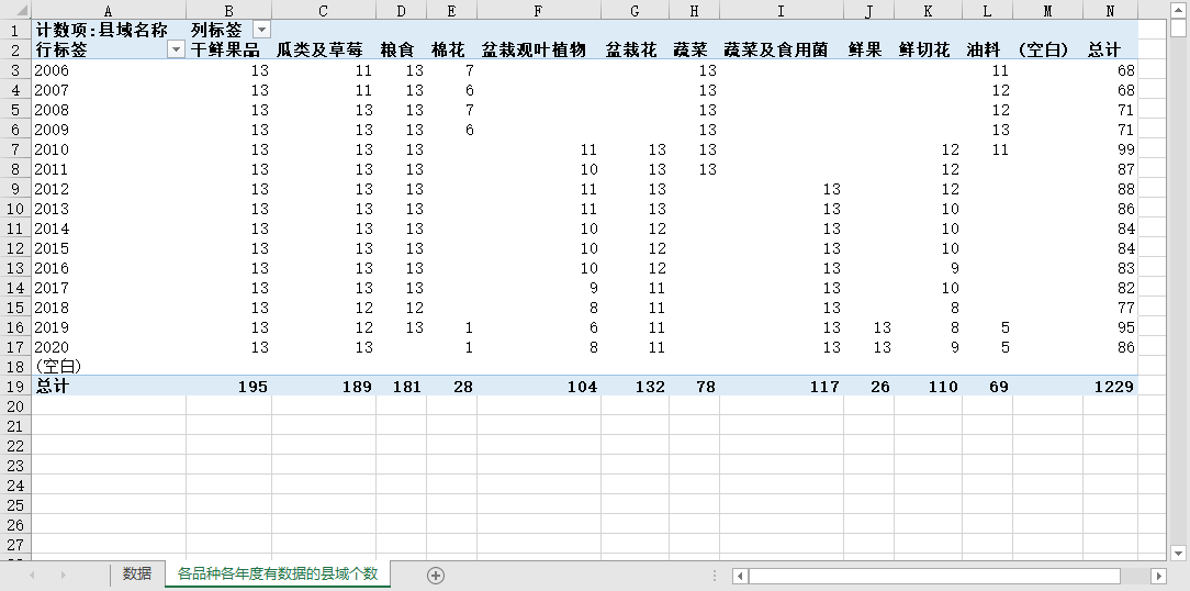农产品的各品种、在各年度有统计数据的县域个数如下:
