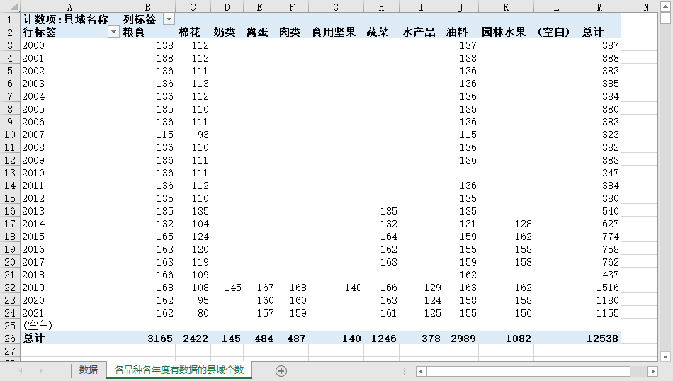 农产品的各品种、在各年度有统计数据的本省县域个数如下(详见图片内容):