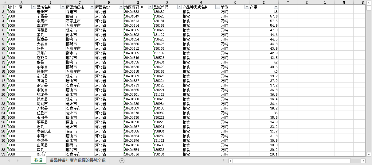 统计年度 县域名称 所属地级市 所属省份 地区编码ID 县域代码 产品种类或名称 单位 产量