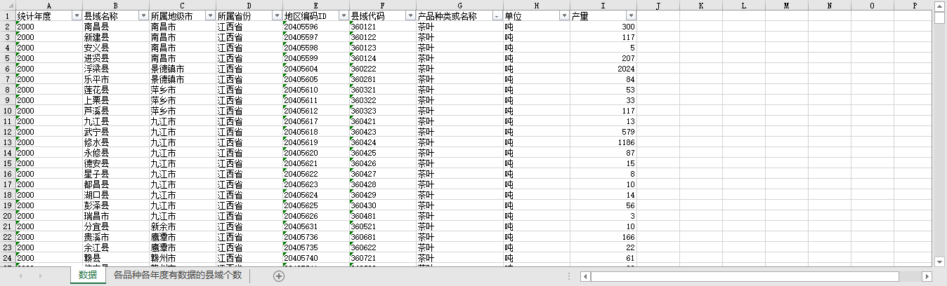 统计年度 县域名称 所属地级市 所属省份 地区编码ID 县域代码 产品种类或名称 单位 产量
