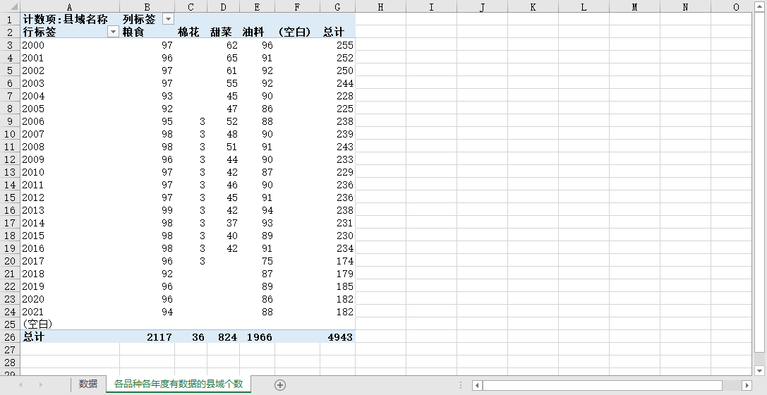 农产品的各品种、在各年度有统计数据的本省县域个数如下(详见图片内容):