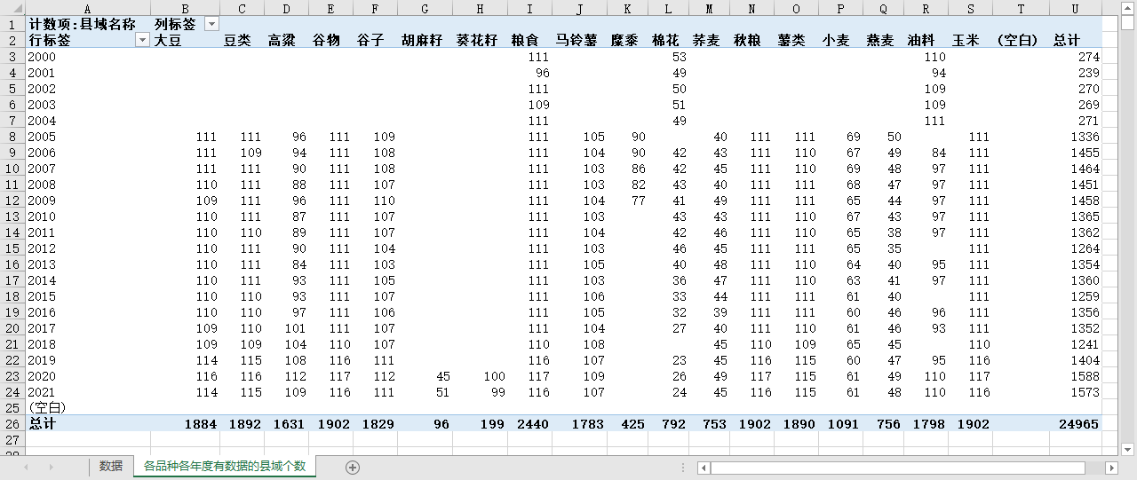 农产品的各品种、在各年度有统计数据的本省县域个数如下(详见图片内容):
