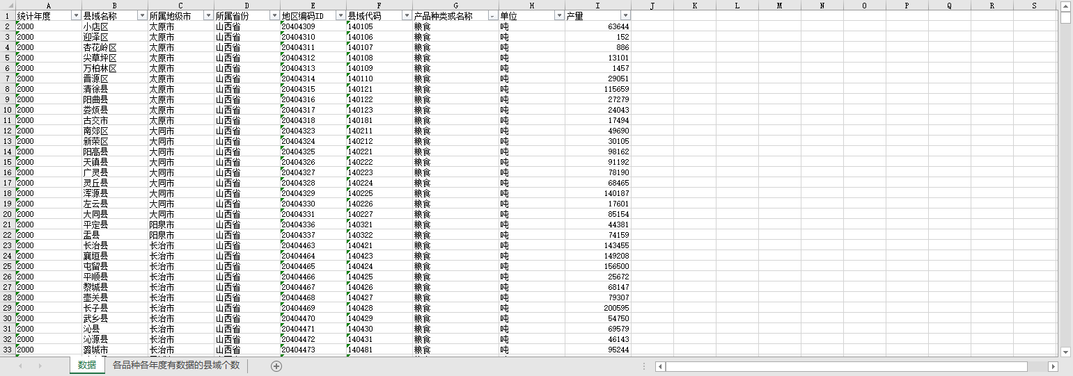 山西省各区县域农产品产量2000-2021大豆类高粱谷物胡麻籽葵花籽糜黍棉花荞麦薯类小麦燕麦油料玉米