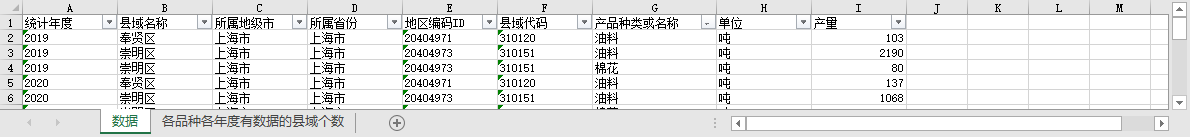 统计年度 县域名称 所属地级市 所属省份 地区编码ID 县域代码 产品种类或名称 单位 产量