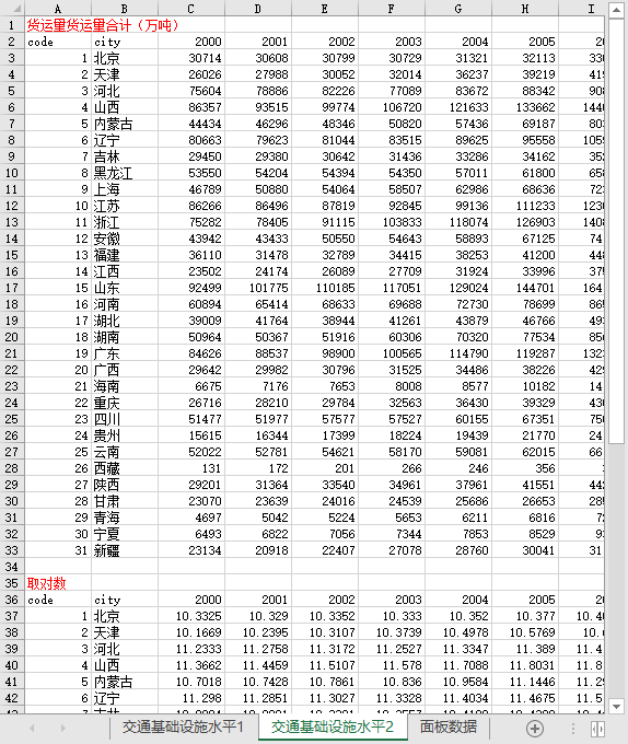 全国31个省份各省级交通基础设施水平2000-2021货运总量公路里程数取对数