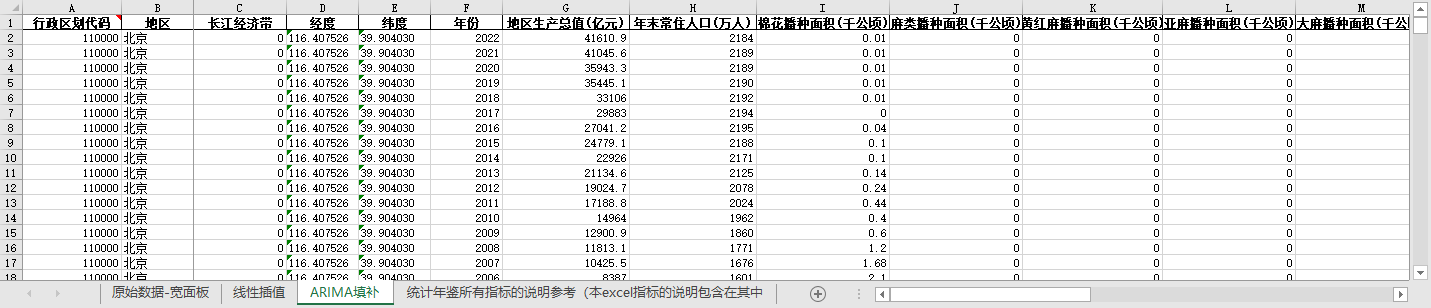 excel数据文件包原始数据-宽面板(由于多年度指标不同存在缺失值)、线性插值、ARIMA填补三个版本,提供您参考使用。